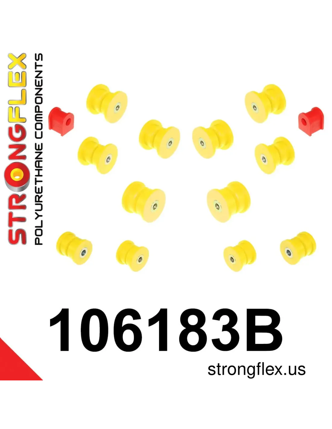 - Some bushes in the kit are only available in 90ShA hardness (yellow) because the original rubber bush is made of a hard rubber compound. The use of the 80ShA hardness bush (red) will reduce the driving of the car to the original rubber bush.