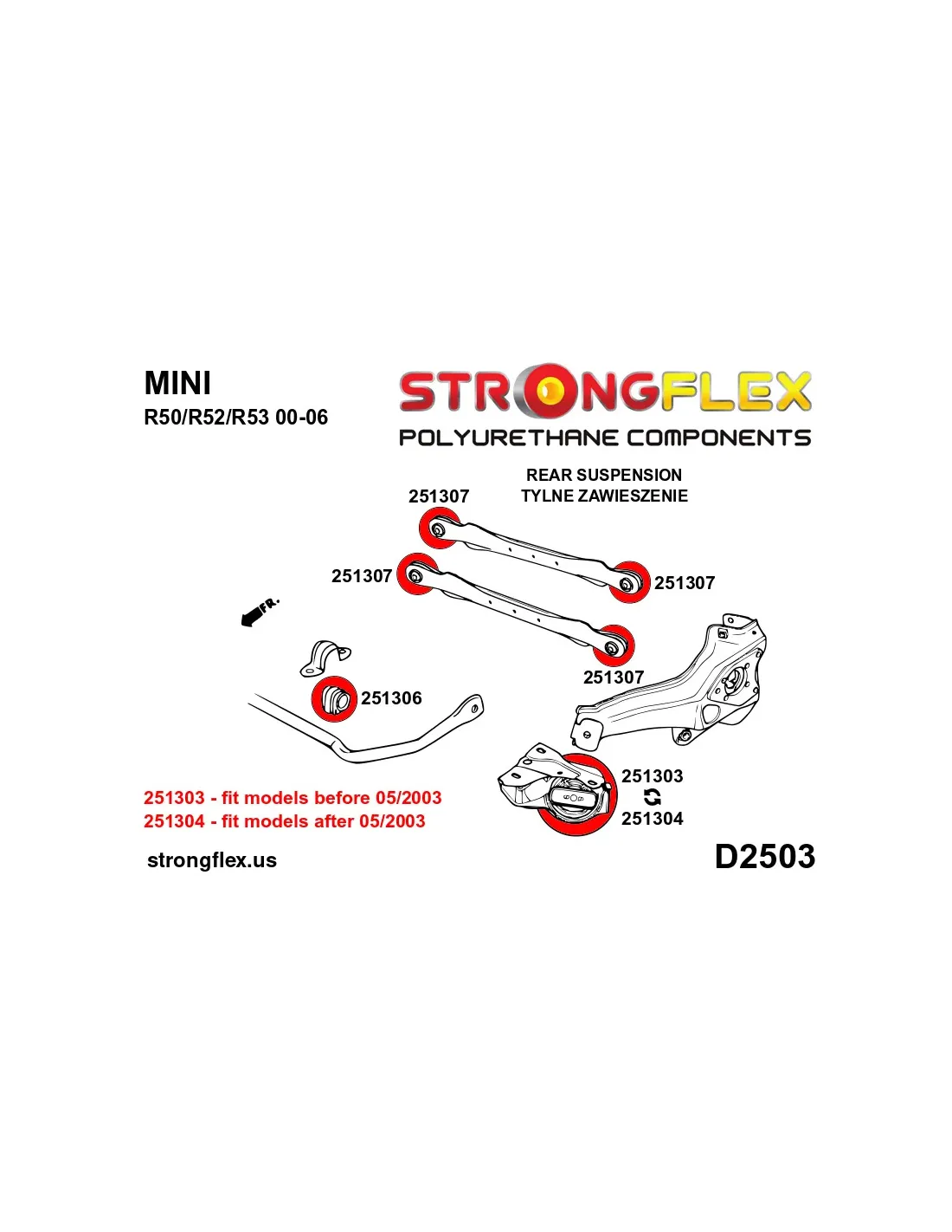 - If you have a model MINI R53 JCW, choose 251305A bushing.